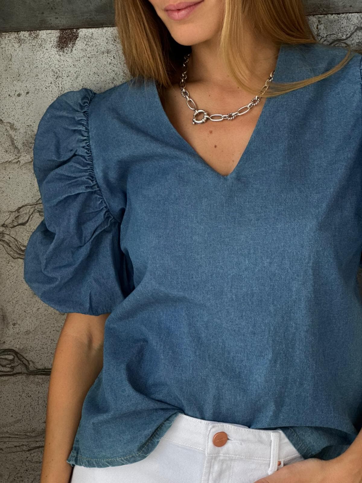 El denim siempre dice presente en el verano, y esta blusa lo confirma.
