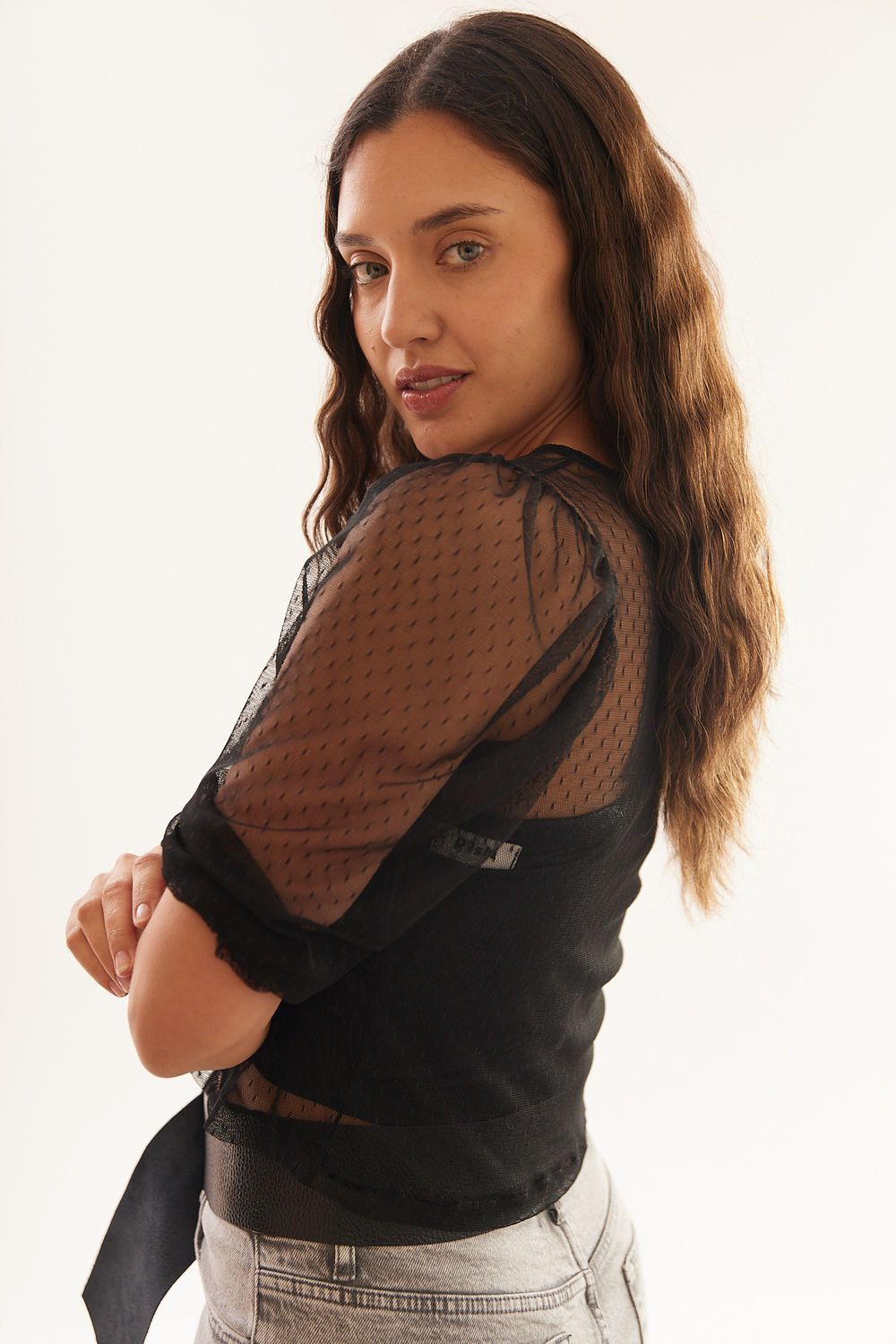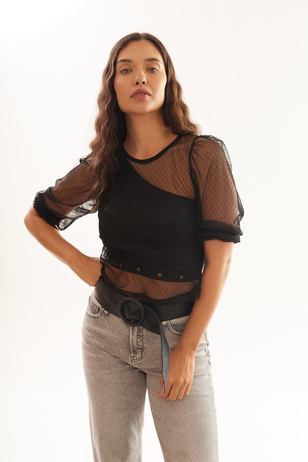 Blusa transparente en plumetí con frunces en los hombros; ideal para usar con un top negro o musculosa por debajo.
