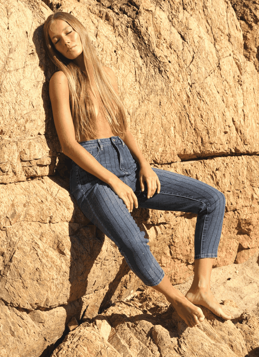 Jean straight tiro medio. Detalles de brillos que lo convierten nuevamente en tendencia esta temporada.
