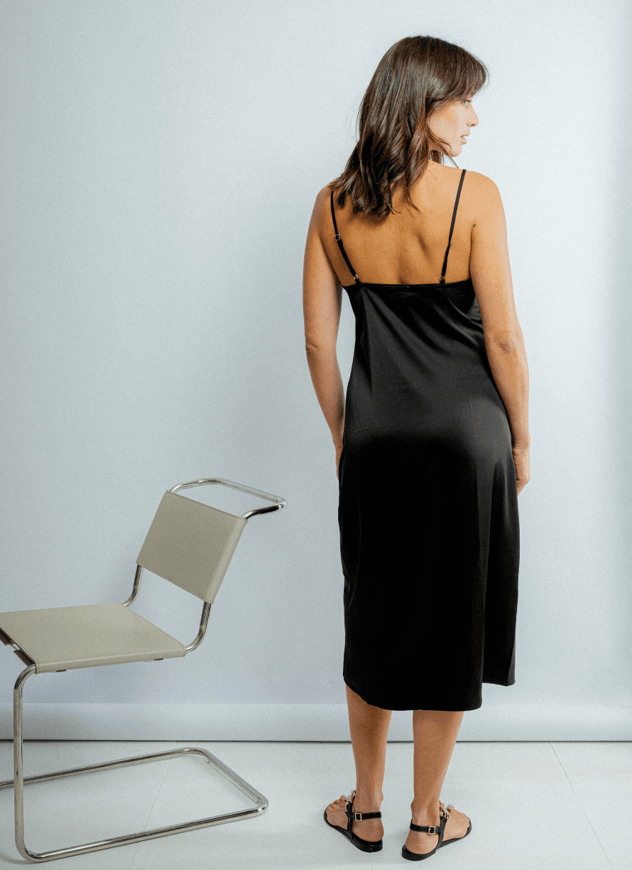 Vestido midi por debajo de la rodilla, escote sutil y tirantes finos. Un básico que todas tenemos que tener en el closet. Ideal para combinarlo con camperas de jean y zapatillas para un look más casual o tacos y blazer para algo más formal. Un verdadero todo terreno